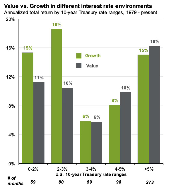 But some investors may not be as well-versed in how interest rates affect stocks, particularly when weighing the differences between value and growth equities. Generally speaking, growth stocks perform relatively better in low interest rate environments, while value shares often lead when 10-year Treasury rates are 4% or higher. Between 3%-4%, history shows, is where the equation roughly balances out between growth and value shares.